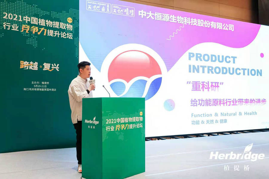 2021年5月20-21日第12屆中國植物提取物行業競爭力提升論壇在海口市舉行,河南中大恒源生物科技股份有限公司銷售總經理金子恒應邀參會,并在論壇作了《“重科技”給功能原料行業帶來的進步》主題演講,引發與會人員的廣泛關注。